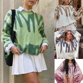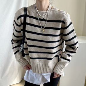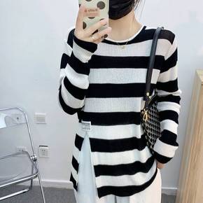 韩国潮牌AD显瘦不规则字母圆领白线边条纹针织衫宽松...