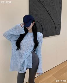 2020亚马逊速卖通欧美外贸长袖圆领撞色镂空开叉针...
