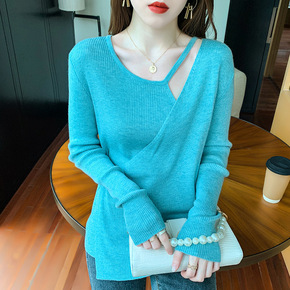 蓝色毛衣打底衫女内搭秋冬设计感不规则露肩长袖针织吊...
