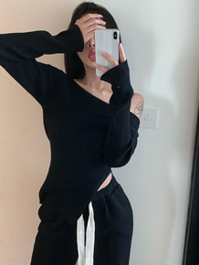 针织衫毛衣女秋季小个子短款V领修身不规则绑带翻领套...