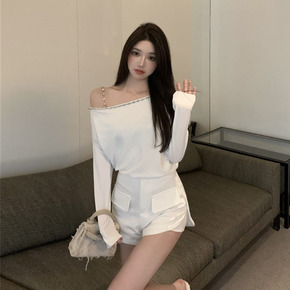 一字肩开叉针织打底衫女秋季2021年新款毛衣短款修...