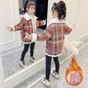 冬装新款女童衣服加绒加厚羊羔绒格子大衣外套中长款毛...