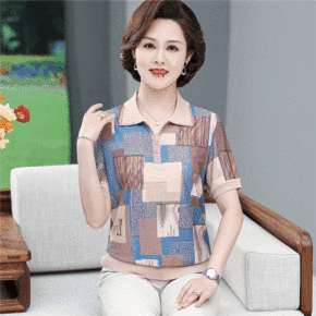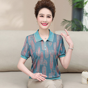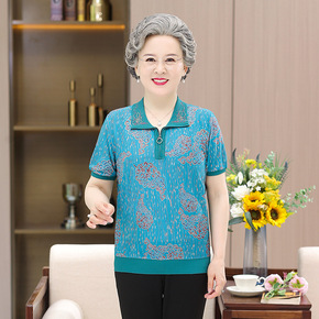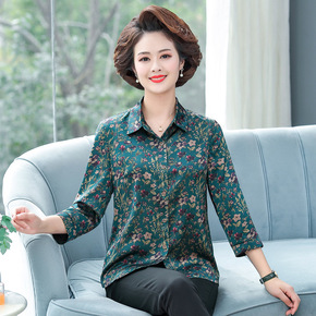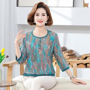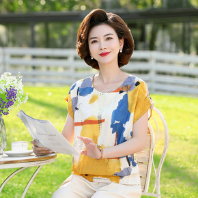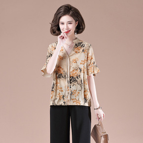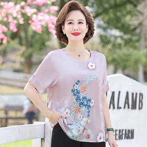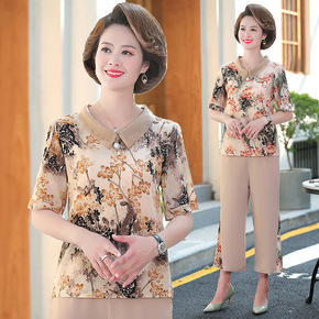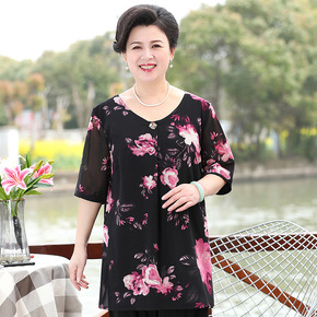 年亲妈妈夏装短袖薄款小衫洋气中老年女碎花雪纺衫中袖...