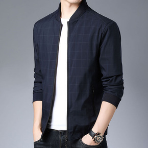黑色夹克男士秋季薄款棒球领中年格子休闲商务爸爸百搭...