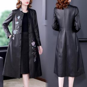 40岁至59中年女装真皮衣中长款妈妈装过膝收腰绣花...