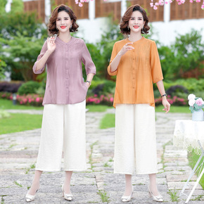 2021新款宽松妈妈小衫夏大码两件套民族风中老年女...