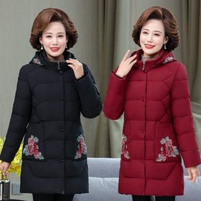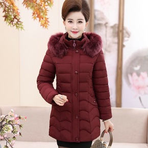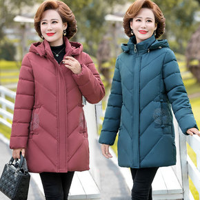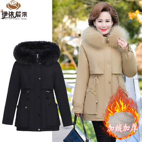 中老年女装冬装外套妈妈中长款加绒加厚棉衣连帽棉服奶...