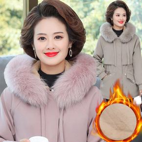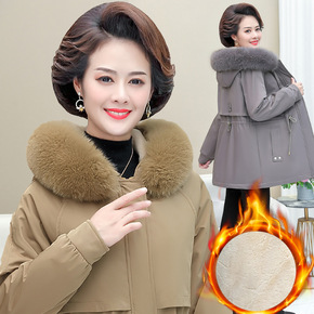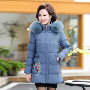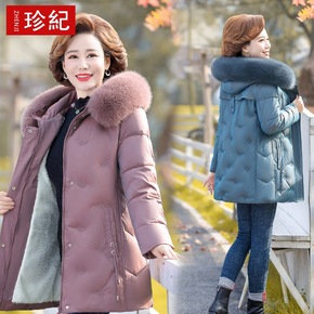 妈妈冬装外套2021新款毛领连帽羽绒棉服中长款大码...