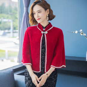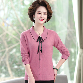 妈妈秋冬新款翻领长袖女士针织衫立领提花中老年开衫大...
