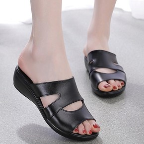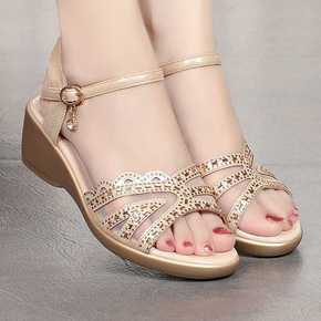 软底中年妈妈真皮凉鞋女2021年夏季新款坡跟防滑软...