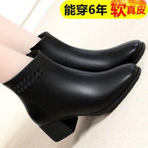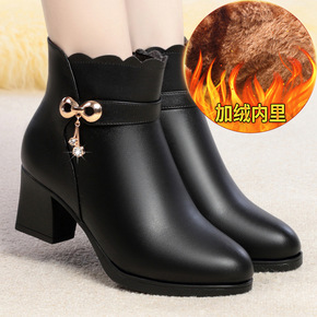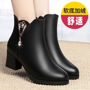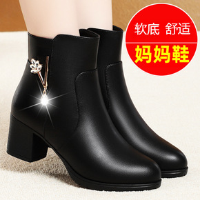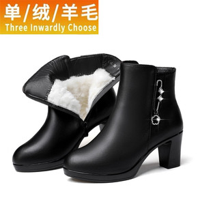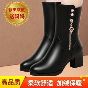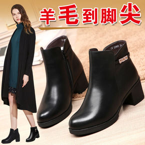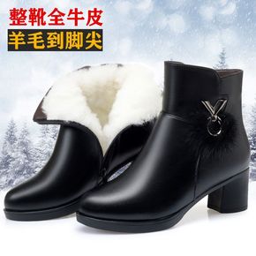 秋冬真皮高跟女靴女式粗跟羊毛短靴保暖妈妈棉鞋中年加...