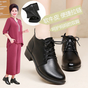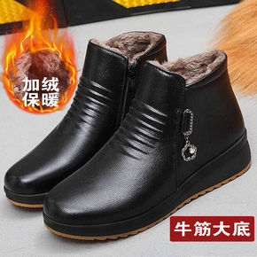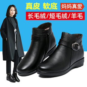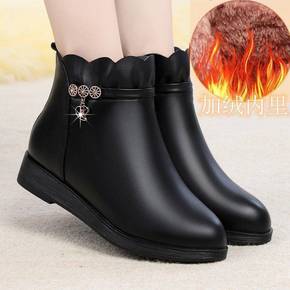 冬季软底羊毛短靴妈妈鞋平底中老年加绒皮鞋中年女鞋老...