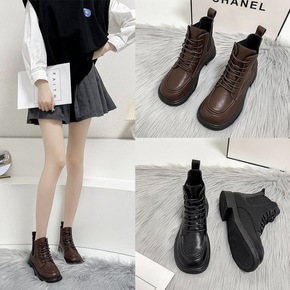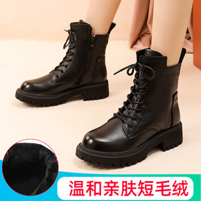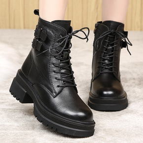 代发真皮马丁靴女英伦风中年皮靴女粗跟厚底加绒妈妈鞋...