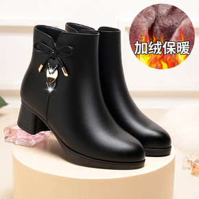 中年女士短靴皮加绒靴子粗跟加厚羊毛皮鞋女中跟冬妈妈...