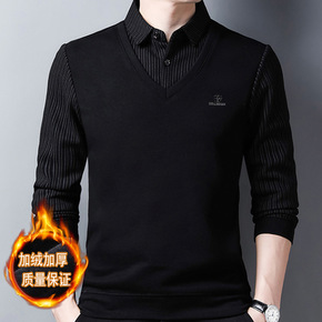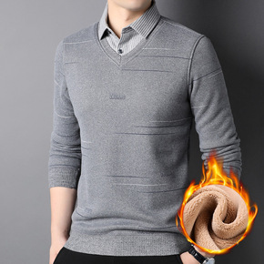 2021冬装新款男式加绒假两件衬衫领毛衣中青年商务...