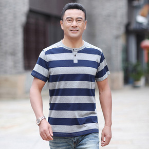 中老年男士短袖T恤圆领爸爸装汗衫条纹休闲男装上衣服...