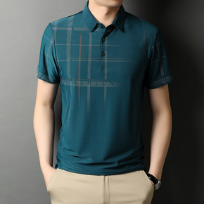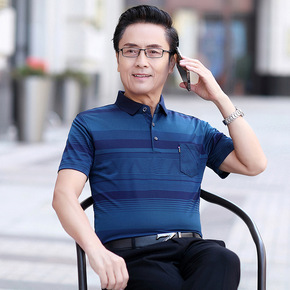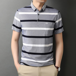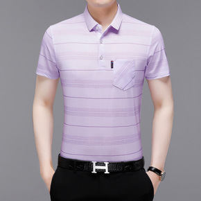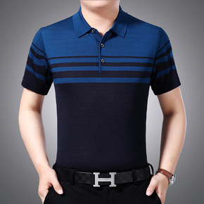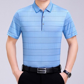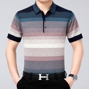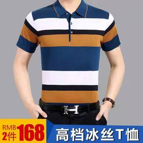 抖音/微商夏季条纹牛奶丝翻领T恤中年男士冰丝短袖休...