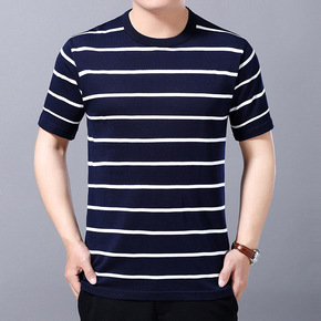 一件代发2021新款男士t恤短袖桑蚕丝真丝条纹中年...