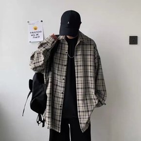 衬衫男士长袖韩版潮流宽松格子衬衣港风日系潮牌帅气休...