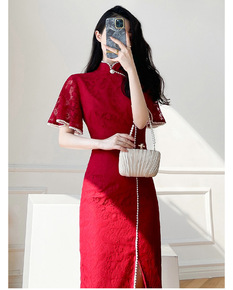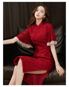 旗袍敬酒服新娘女酒红色蕾丝结婚订婚回门小礼服连衣裙...