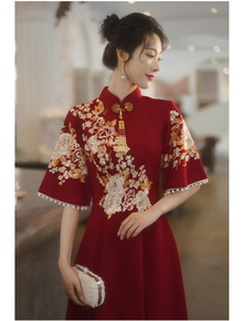 旗袍敬酒服2021新款复古酒红新娘结婚订婚礼服女回...