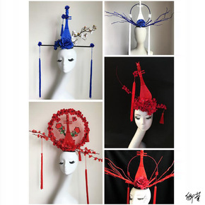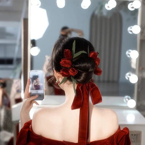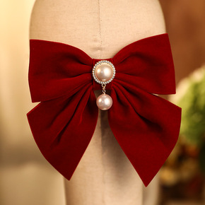 中式新娘敬酒服结婚红色大蝴蝶结头饰丝绒发夹女订婚绒...