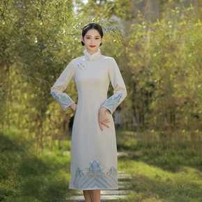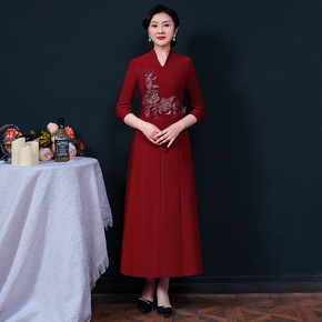 长款旗袍连衣裙妈妈装低领奥黛刺绣绣花气质婚宴装中年...