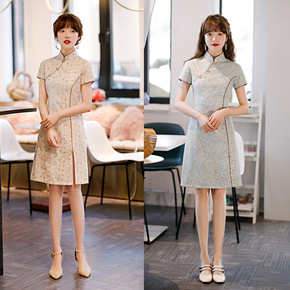 2020春夏新款改良旗袍短款连衣裙织锦缎复古花纹修...