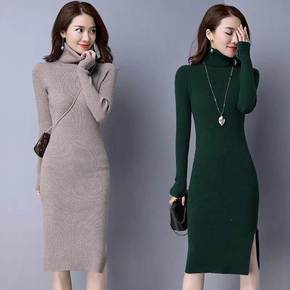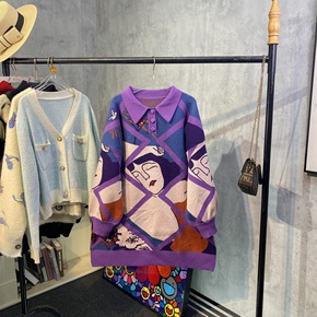 秋冬新款复古撞色条格卡通头像慵懒风针织连衣裙毛衣中...