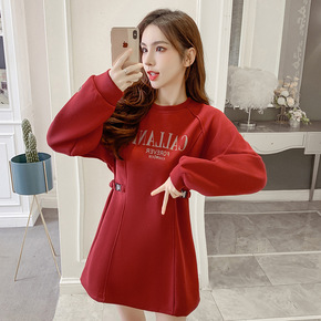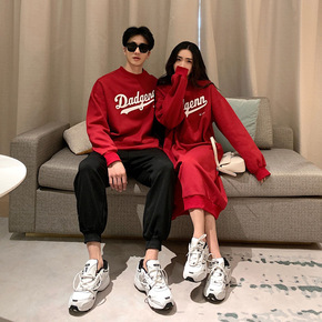 阿姐家大麦自制情侣装冬季新款气质字母红色卫衣宽松连...