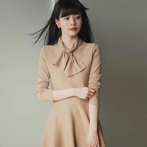 法式连衣裙新款纯色围巾领长袖中长裙秋季气质小香风毛...