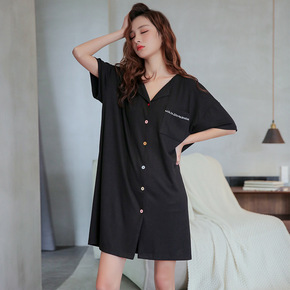 棉质V领短袖睡裙女彩色纽扣简约韩版可爱家居短裙宽松...