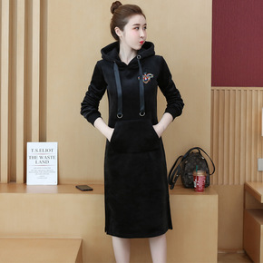 双面金丝绒卫衣女中长款2021秋冬刺绣显瘦连帽加绒...