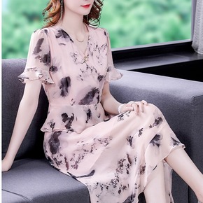 V领水墨印花雪纺连衣裙夏2021新女气质显瘦中国风...