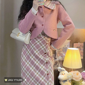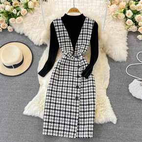 毛呢格子套装裙女2021秋冬新款气质显瘦背带连衣裙...