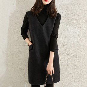 优雅气质V领连衣裙女2021秋冬新款减龄显瘦外穿无...