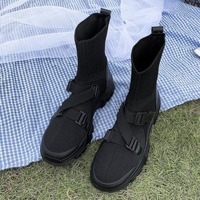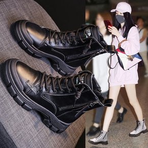 马丁靴女2021秋冬新款时尚厚底弹力靴增高透气系带...