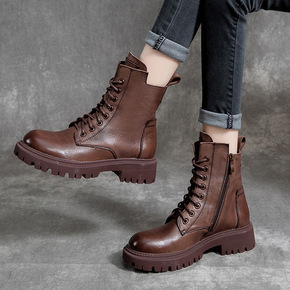 上海杰骤复古手工大头娃娃鞋头层牛皮短靴系带女鞋高帮...