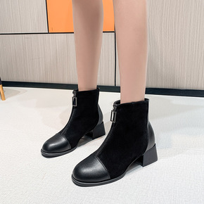 大码41-43小香风靴子女2021新款粗跟短靴女时...