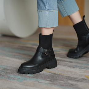 跨境2021秋冬新款韩版时尚弹力飞织单靴中筒厚底大...