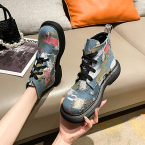 迷彩马丁靴女英伦风2021年秋新款松糕厚底系带单靴...