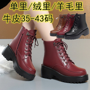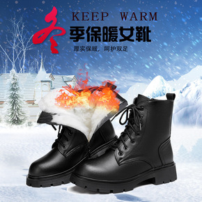 冬季羊毛女式皮靴中跟棉皮鞋粗跟高跟中年棉靴加绒妈妈...