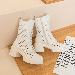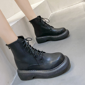 真皮马丁靴女2020秋冬新款高跟粗跟中筒靴防水台厚...