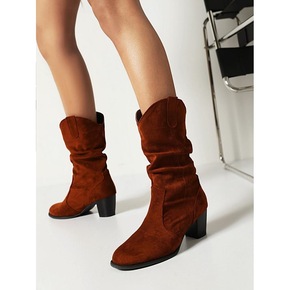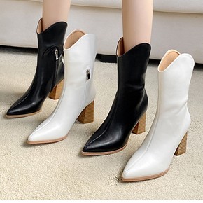中筒靴女2021新款春秋单靴粗跟马丁靴尖头显瘦西部...