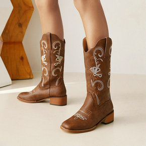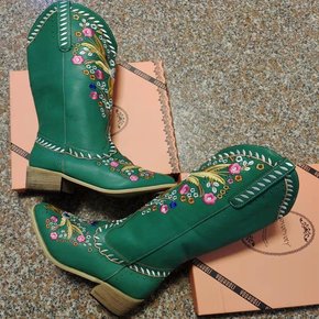 花朵中筒靴 粗跟印花外贸欧美风女靴码独立站7-10...