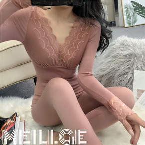 秋衣秋裤女士薄款蕾丝V领口紧身美体保暖内衣打底套装...