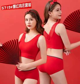 大红色内衣套装女内裤本命年婚嫁无痕无钢圈固定杯背心...
