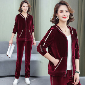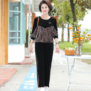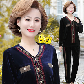 中老年女金丝绒两件套中年大码洋气烫钻套装妈妈秋装长...