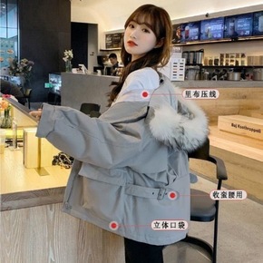 大毛领工装棉衣棉服女冬季2021新款宽松连帽中长款...