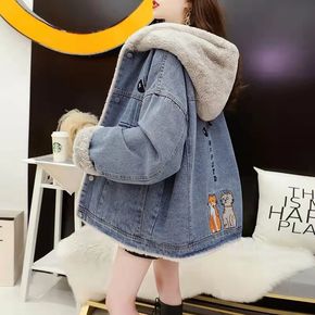 牛仔外套加绒加厚冬款女学生2021新款连帽刺绣韩版...